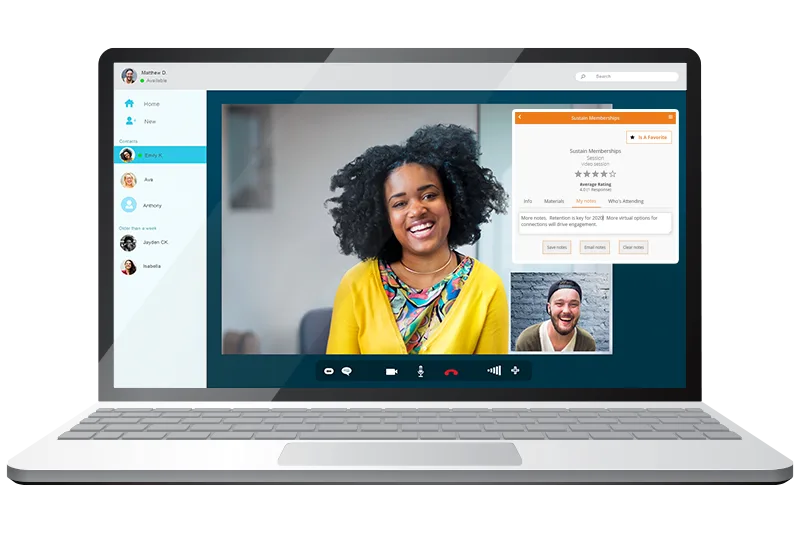 Access Zoom meetings and interact with live and virtual attendees. Virtual attendees become active participants with the same tools and engagement opportunities as live participants.